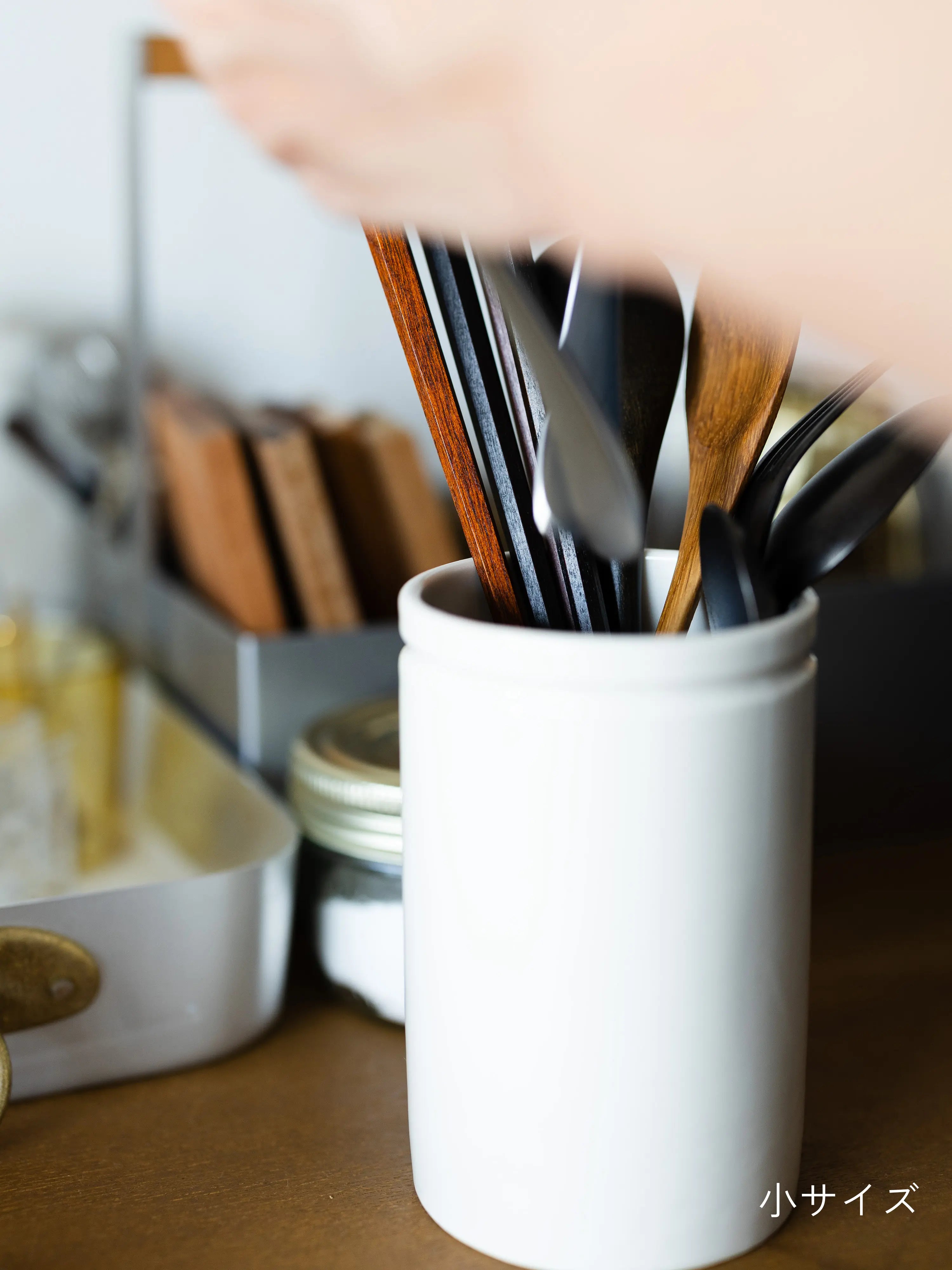 この2サイズは、高さだけでなく口径にも差がありますから、場所を取らずにスリムに収めたい場合は小、たっぷりと入れたい場合は大、という選び方もおすすめです。小サイズに菜箸とシリコンべらなどの調理道具を入れても、コンパクトに収納できますよ。