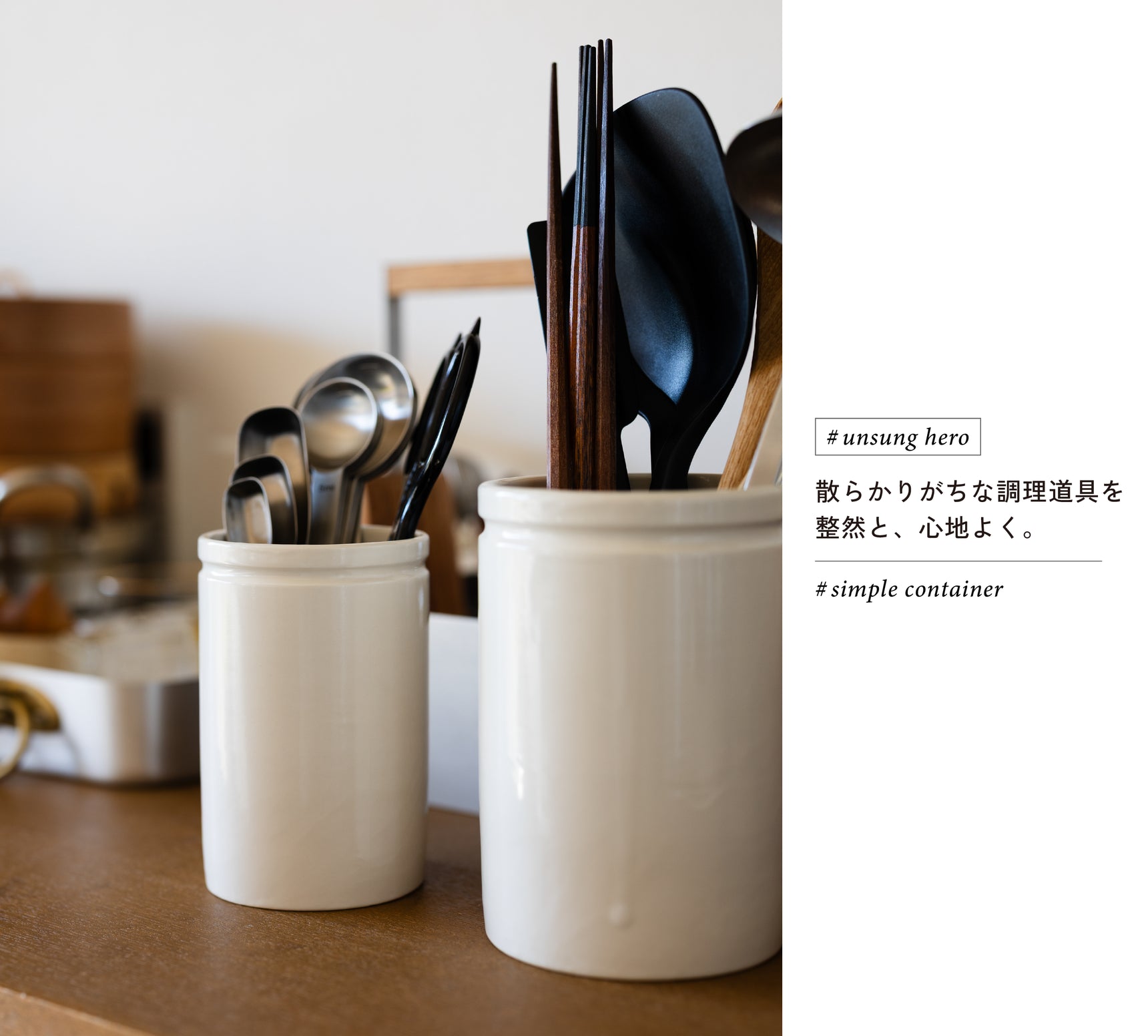 大と小、2つのサイズがあり、どちらか一方だけでも、大と小で使い分けても、同じサイズのものを複数並べてもバランスする、ちょうどいい大きさです。大サイズは、おたまやヘラ、菜箸といった背の高い調理道具がしっかりと収まる大きさ。小サイズは計量スプーンや木さじなどが取りやすく安定しますし、お箸やスプーンなどのカトラリーにぴったりです。