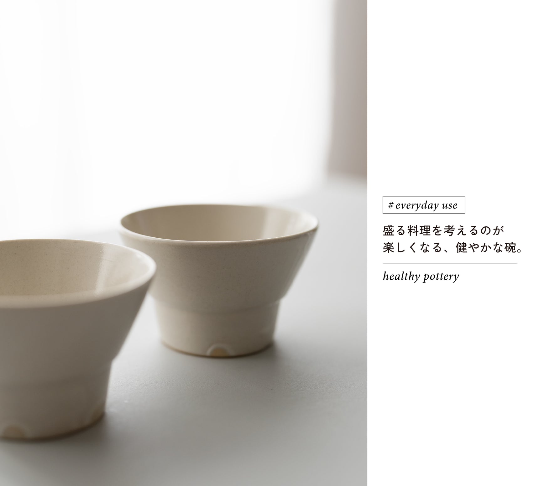 この「くらわんか小碗」、正式には子供メシ碗と名づけられている作品ですが、伊藤さんがもともと大人用の飯碗として作っていた「くらわんか碗」を、息子さんのお食い初め用にと、小さなサイズで作ったのが始まり。高さのある高台、すっと伸びた胴の部分と、余計なものがないすっきりとした形に、とろりとかかる柔らかなミルク色の釉薬。そのバランスが見事で、食器棚に置いた時の、凛としつつも温かな佇まいには見惚れてしまうほどです。