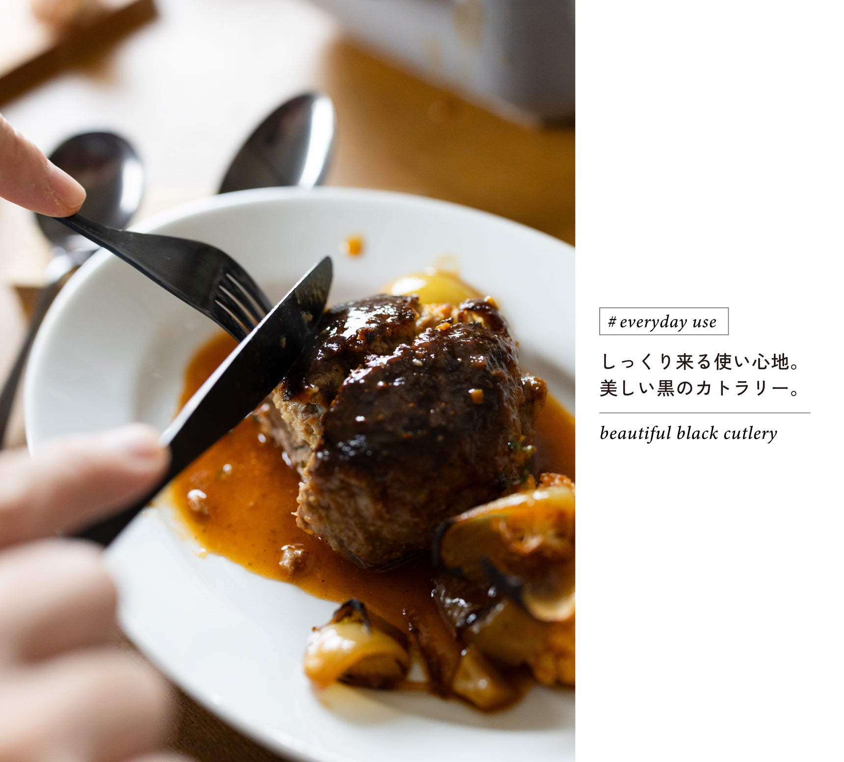使い心地の良さばかり語ってしまいましたが、このカトラリーのいちばんの特徴は、黒色であること。白の食器に合わせると食卓が引き締まり、新鮮な雰囲気になりますし、黒やグレー、ガラスなどのプレートと一緒に使うと、クールさがより際立ち、まるでモダンなレストランのような印象的なコーディネートになります。