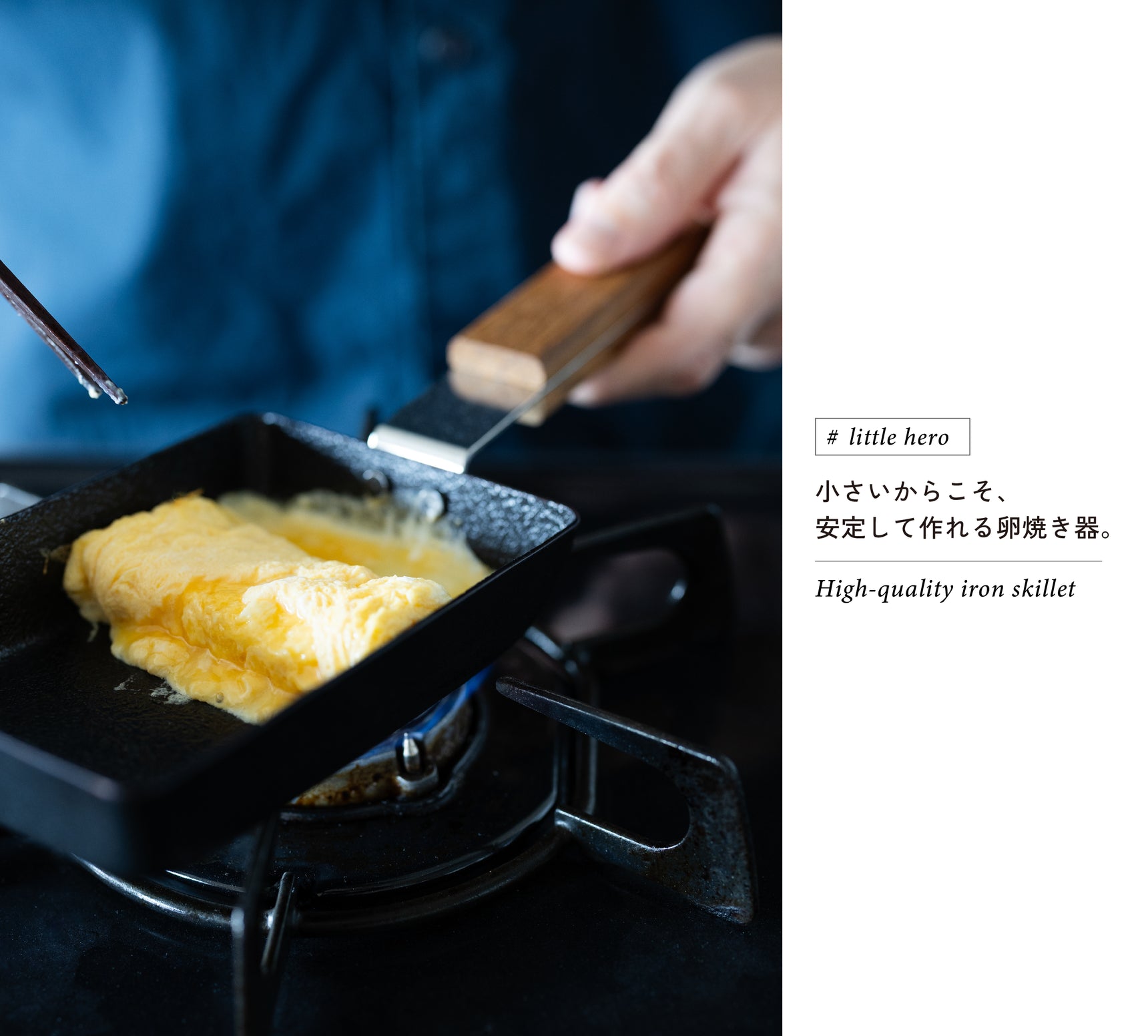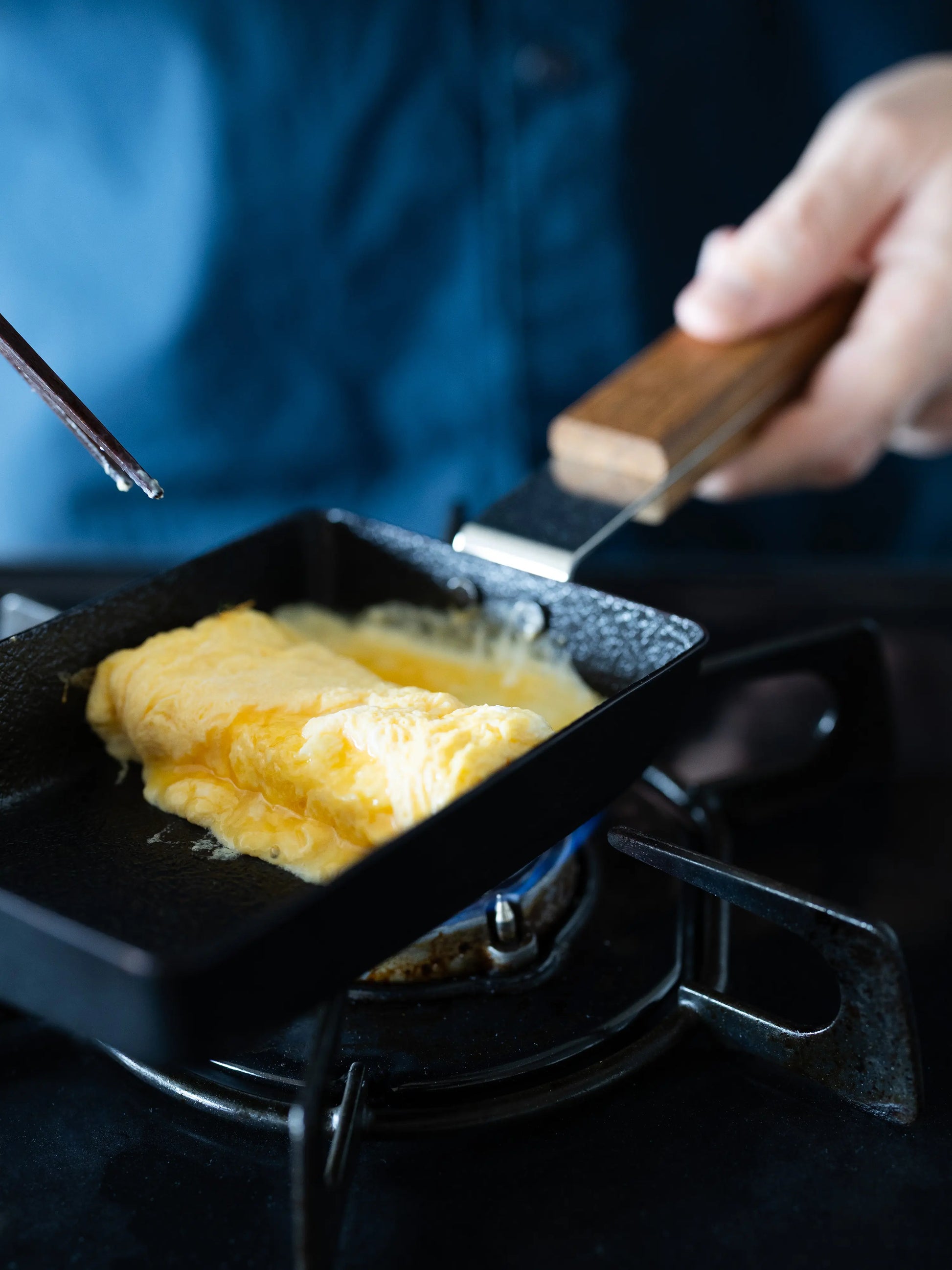鉄製の鍋は蓄熱性が高く、熱が全体に均一に伝わるため、焼きムラになりにくいという特徴があります。また、鉄に油が馴染むことで、余分な油分・水分が食材に戻るのを防ぐ利点があるそう。この特性が、短時間で均質に火を通し、余計な水分を飛ばしてふっくら仕上げたい卵焼きと大変相性が良いです。とくに小さい鍋ですと一気に熱くなり、ジュッと表面だけ焼けてしまうことがありますが、この卵焼き器はやわらかく均一に火が入り、焦らずに料理できるのもいいところだなと思います。