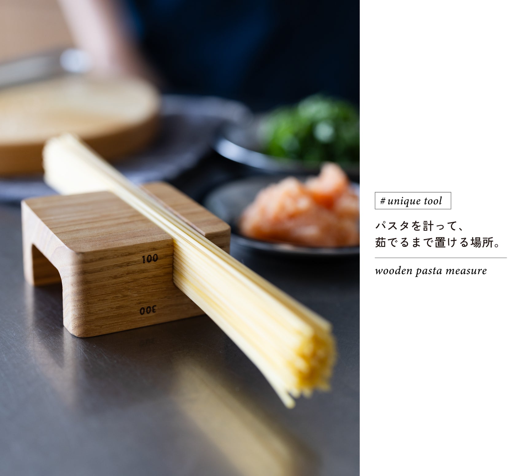 長いパスタを置いてもぐらつかない安定感がありますが、手に収まるサイズで、収納も場所を取りません。取り出しやすい引き出しなどにしまっておいて、さっと出して計量し、パスタを鍋に投入したらすぐに片づける。ひとつ持っておくと、スムーズにパスタ作りができる道具だと思います。