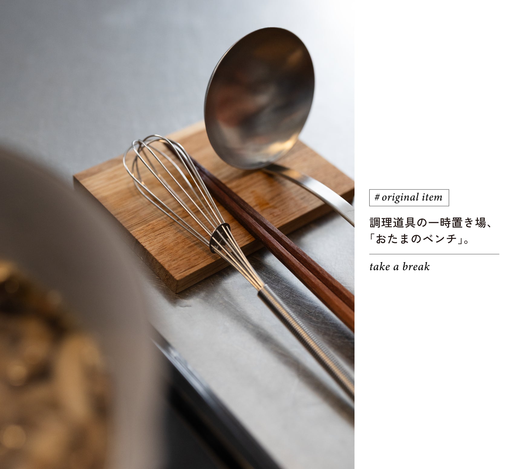 気軽に使うものなので、出すのが億劫にならないよう、軽さのあるアカシアの木を素材に選び、調理道具の接地部分だけを支える程度の、必要十分な大きさに。それ以上の装飾はなくしました。調理道具が一時的に腰かけるベンチとして、ぜひ使ってみていただきたいです。