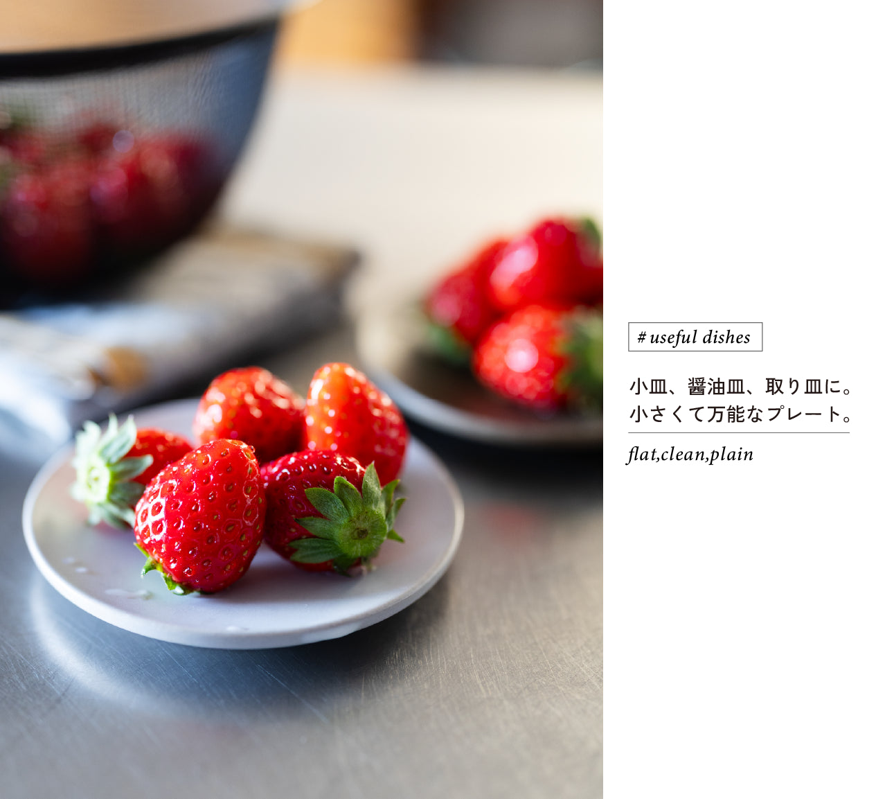 この小皿も、他のプレートと同じように、クリーンで癖がなく、洋食器にも和の陶器にも合いますし、ガラスや金属や木など他の素材の器と組み合わせても違和感がありません。マットな釉薬で仕上げられていることも相まって、クールな脇役として場を引き締め、引き立ててくれるような、かっこいい存在の小皿です。