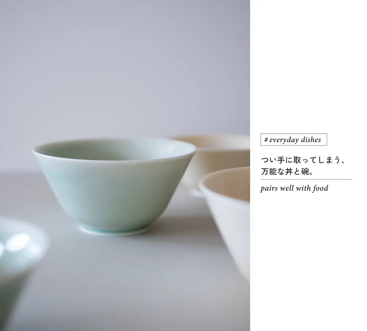 たくさん食器を持っていても、自然とよく手にとってしまい、思えばこの器ばかり使っているなということがあったりします。僕にとって、この器はまさにそのような存在です。すっと手に馴染むかたち、透明感のある清らかな色合い、手にしたときに疲れない薄さと軽さ、磁器ならではのすっきりとした印象。和も中華もエスニックにも、ジャンルレスで調和してくれる、バランスのとれた頼もしい器です。